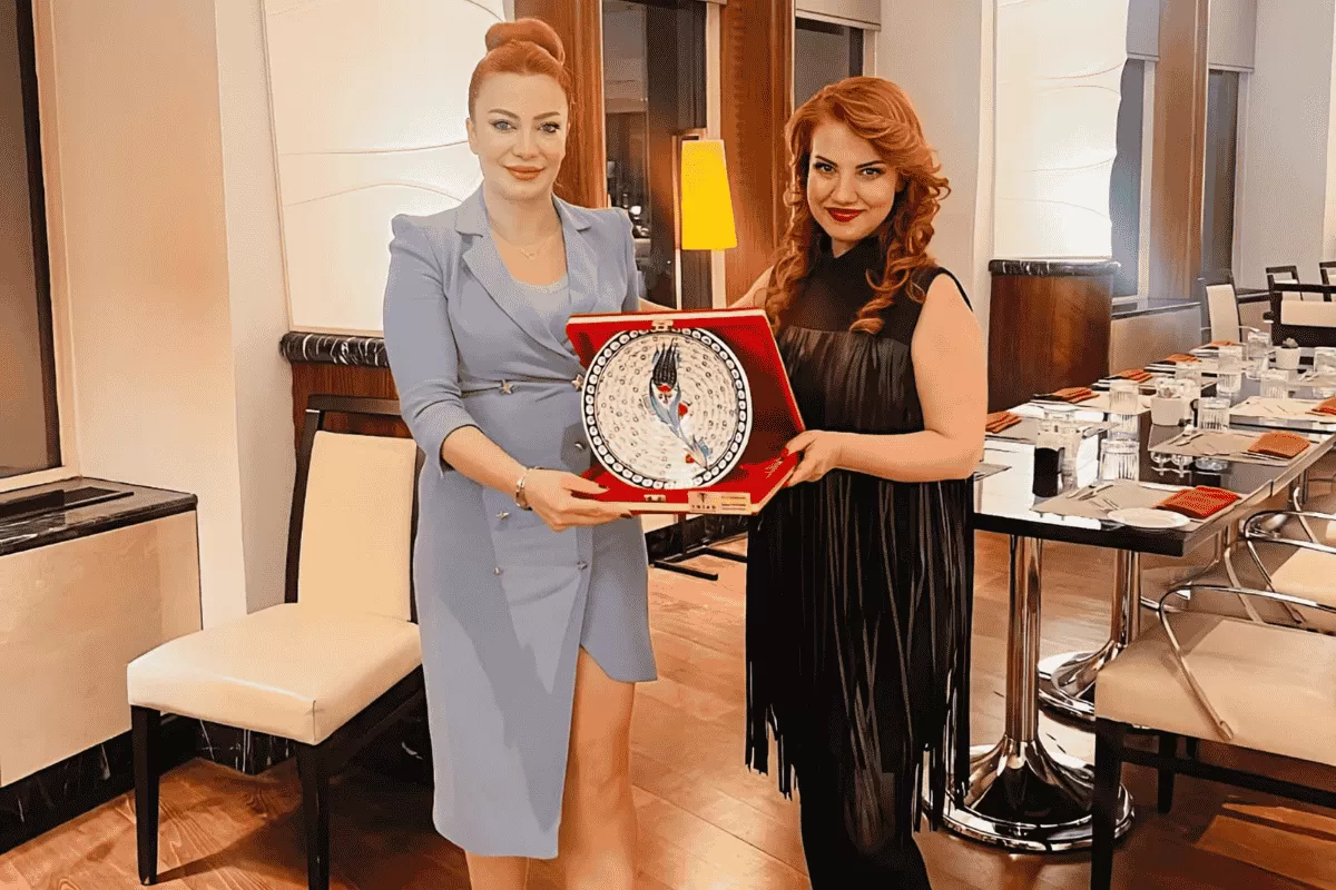Gecede Türk-Rus İş Adamları Derneği Başkan Yardımcısı Bensu Pınar Aktel, Kadın Liderler Kulübü adına Başkan Kıvılcım Kalay’a özel bir hediye takdim etti.